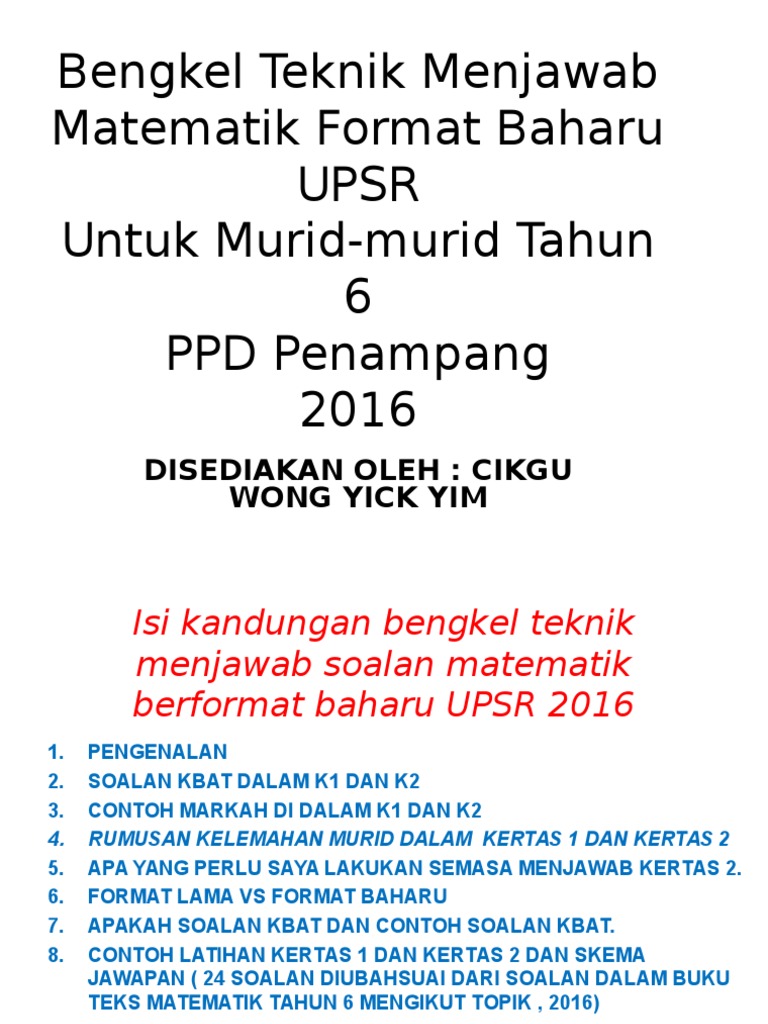 Instrumen baharu matematik kertas 2 peperiksaan upsr 2016 (versi bm) ujian pencapain sekolah rendah 2016 matematik kertas 1. Soalan dalam bahasa inggeris mendahului soalan yang 5 i sepadan dalam bahasa melayu. Modul gemilang matematik upsr (kertas 1 dan kertas 2). Erata kertas matematik (1449/2) percubaan ??erata skema pemarkahan kertas 2 matematik no. Saya upload sekali lagi soalan sebenar matematik upsr 2016 (kertas 2) untuk rujukan pelajar yang akan menduduki peperiksaan upsr pada tahun 2018.