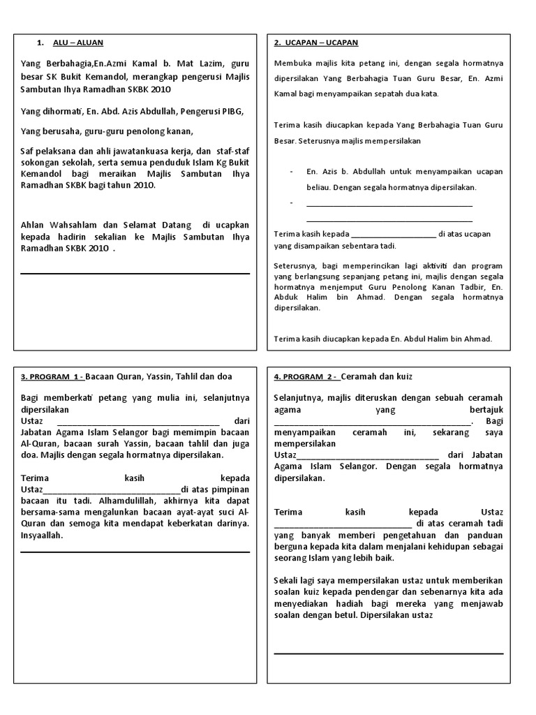 Ka#a a+u.a+ua salam ramadhan kami hulurkan, dengan izinnya kita ditemukan, rasa syukur kami lafazkan. Apabila kamu diminta berdiri dari majlis rasul untuk memberi ruang bagi orang lain atau kamu disuruh pergi dari majlis rasul maka hendaklah kamu berdiri, karena rasul terkadang ingin bersendiri untuk. Naib pengerusi jawatankuasa kurikulum daerah. Majlis dengan segala hormatnya mem persilakan. Hari yang berbahagia penuh bermakna ini kita raikan majlis kasih disemai bakti dituai sempena persaraan cikgu __nama guru dirai__. Syukur dalam agama islam mempunyai peranan yang penting dalam mengatur tindakan yang berangkat dari hati. Kumpulan teks ceramah dan khutbah jum'at. … terima kasih diucapkan kepada. Bagi memastikan majlis berjalan dengan lancar, hadirin diingatkan agar mematikan atau memastikan telefon bimbit berada dalam pengaturcaraan senyap. Contoh teks pengacara majlis majlis perkahwinan adha & azwan. Tanpa kejujuran agama tidak lengkap, akhlak tidak sempurna,dan seorang manusia tidak sempurna menjadi manusia. Contoh teks pengacara majlis / ucapan emcee majlis persaraan cikgu. Negeri sabah untuk menyampaikan ceramah ramadhan yang bertajuk 'fadhilat dan amalan dibulan ramadhan'.