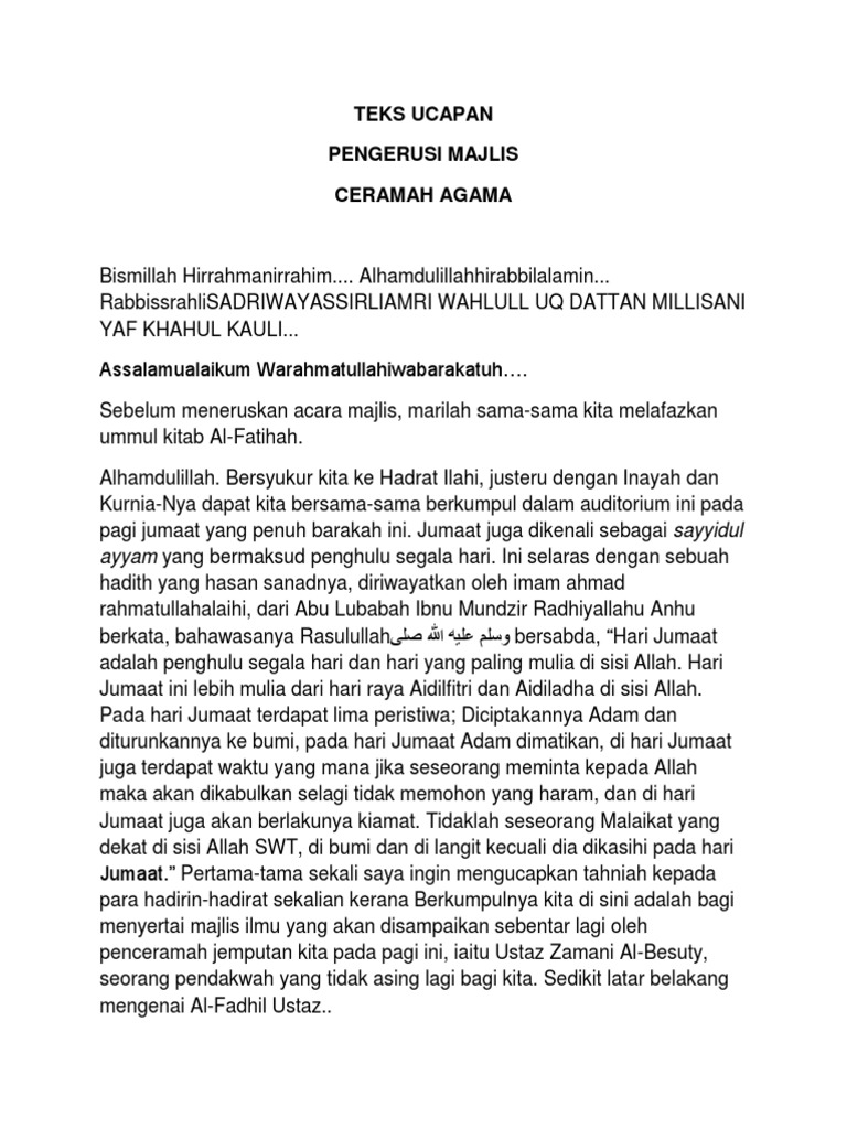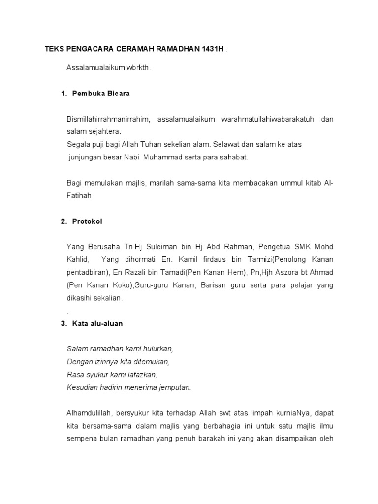 Teks Ucapan Mc Minggu Silaturrahim 2013 New 1 Doc Document from demo.vdocuments.mx Syukur dalam agama islam mempunyai peranan yang penting dalam mengatur tindakan yang berangkat dari hati. Naib pengerusi jawatankuasa kurikulum daerah. Teks ucapan pengacara majlis mesyuarat agung tahunan. Mari tegakkan persatuan umat islam. Teks ceramah agama islam by aa gym ini bertema bagaimana agar amal tetap bermakna. simak tips dan triknya, semoga kita tidak terjebak dengan amalan pepesan kosong tanpa makna sama sekali! Contoh teks pengacara majlis majlis perkahwinan adha & azwan. Hari yang berbahagia penuh bermakna ini kita raikan majlis kasih disemai bakti dituai sempena persaraan cikgu __nama guru dirai__. Mencari contoh teks ceramah singkat untuk kultum di sekolah atau masjid di dekat rumah?