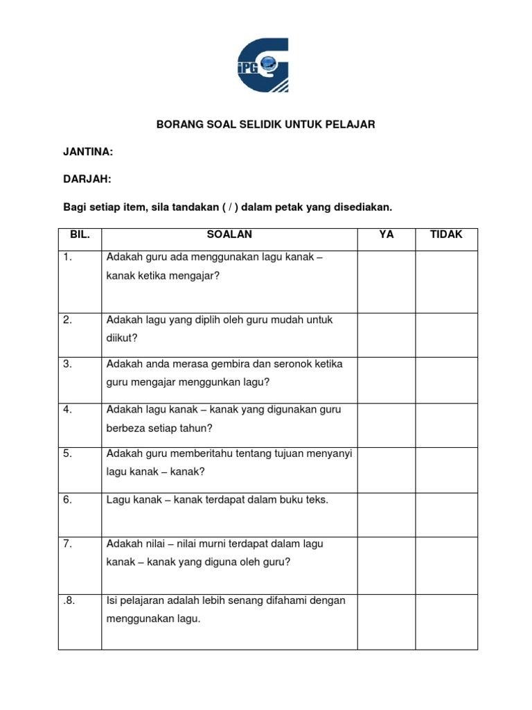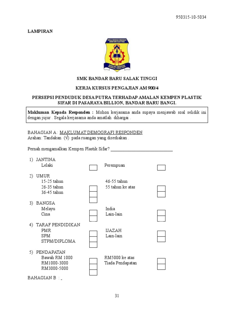 Borang kaji atau soal selidik ini perlu dibuat dalam perlaksanaan dan disertakan dalam pelaporan tugasan wajib bagi ujian pelbagai instrumen (geografi) pentaksiran tingkatan 3 (pt3) kajian lapangan atau lebih dikenali sebagai kerja kursus, agar menjelaskan lagi hasil dapatan dan maklumat yang.