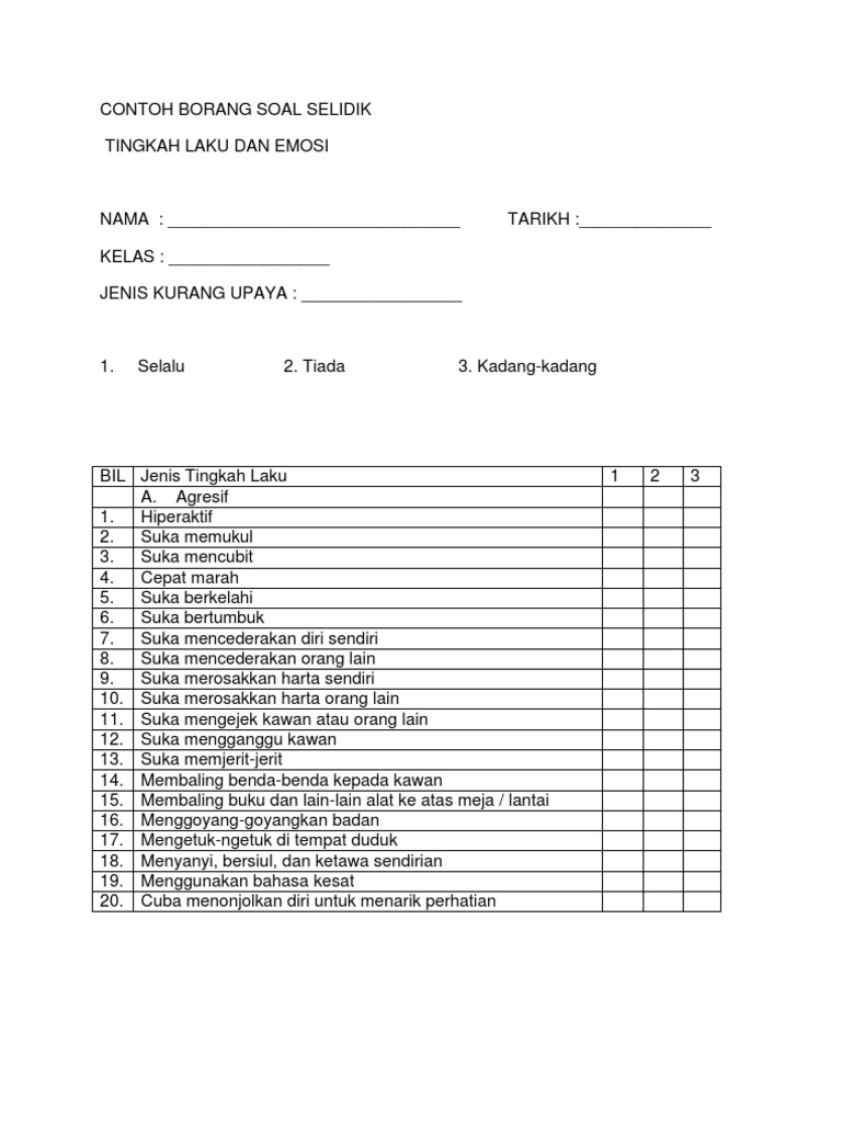 Related : Maksud Borang Soal Selidik / Borang Soal Selidik Tingkah Laku Emosi K - Koperatif dalam pembelajaran dan pengajaran sains d..